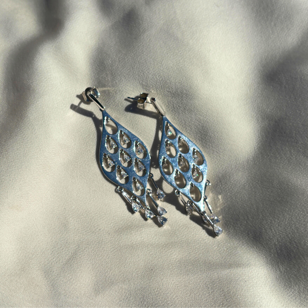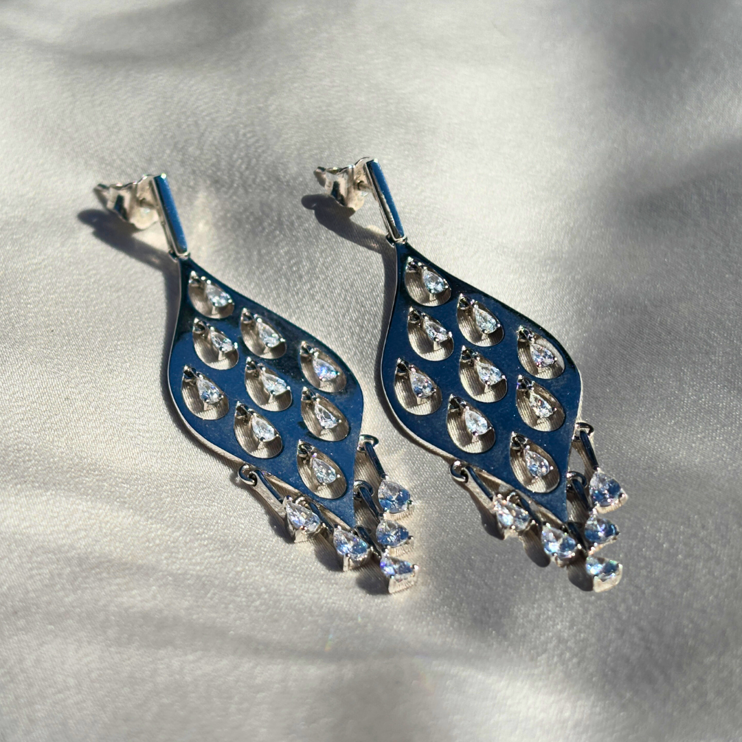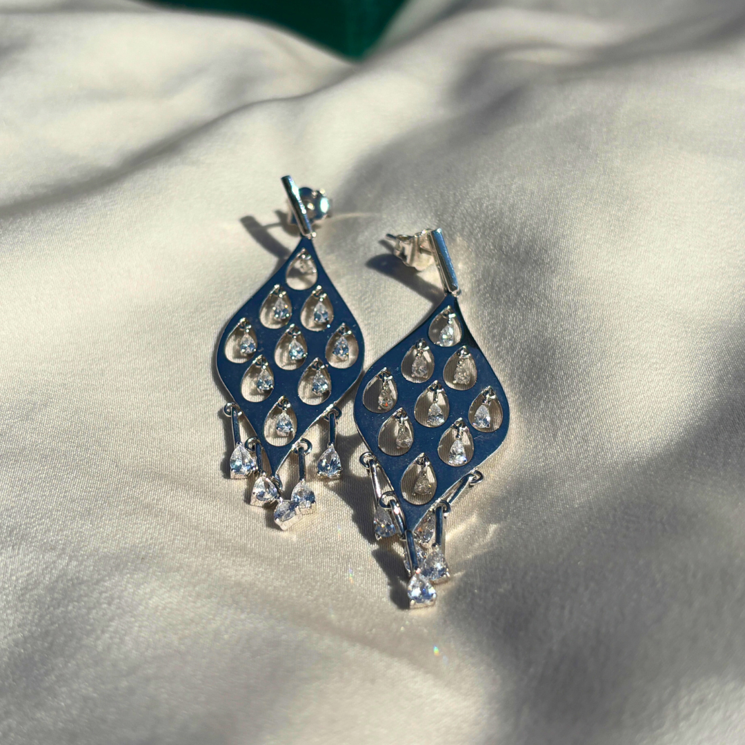 Handcrafted in sterling silver, each teardrop-cut crystal catches the light like falling rain, sculpted to reflect both precision and poetry.