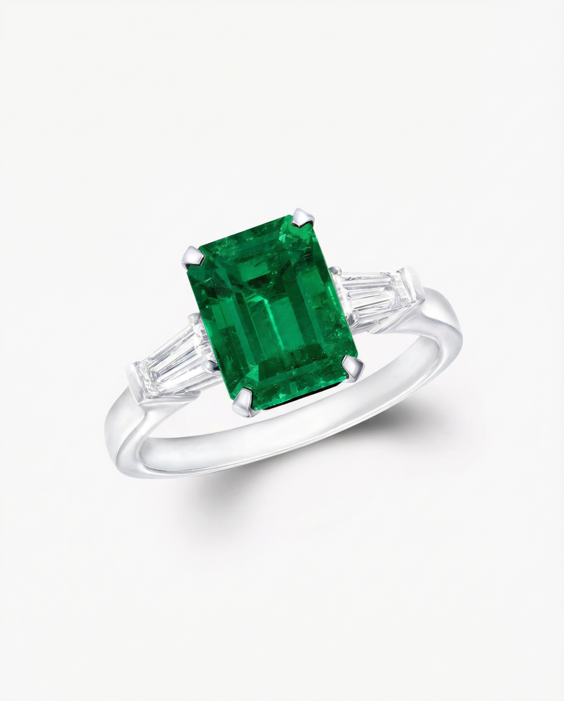 The Imperia Emerald Ring centres an emerald-cut green emerald, selected for its rich saturation and natural character. Clean lines and sculptural claw settings frame the centre stone with precision, while tapered baguette diamonds sit quietly at the shoulders, lending balance and architectural clarity to the design.