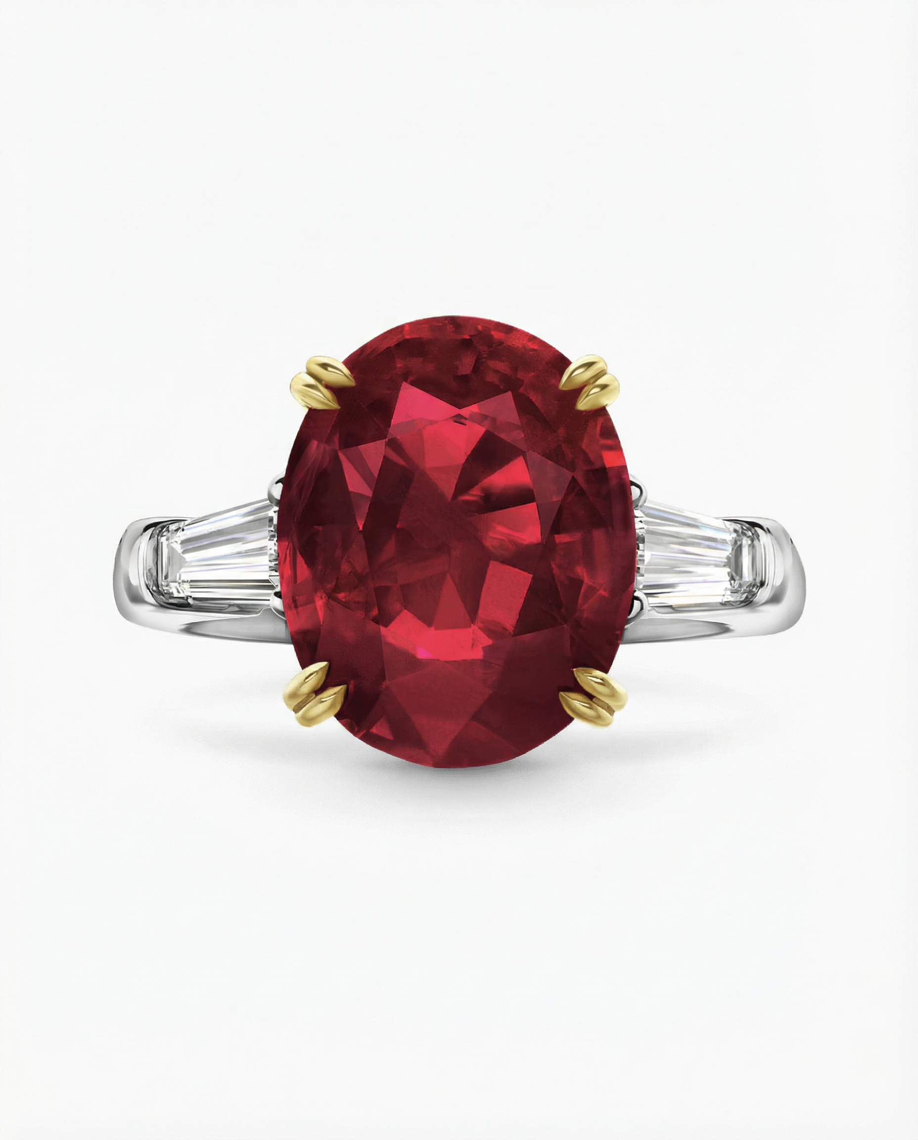 The Imperia Oval Ruby Ring centres a vivid oval-cut ruby, hand-set and allowed to speak for itself. Sculptural claw settings and elegantly tapered baguette diamonds frame the centre stone, creating a fluid, architectural silhouette that enhances its depth, fire, and presence from every angle.